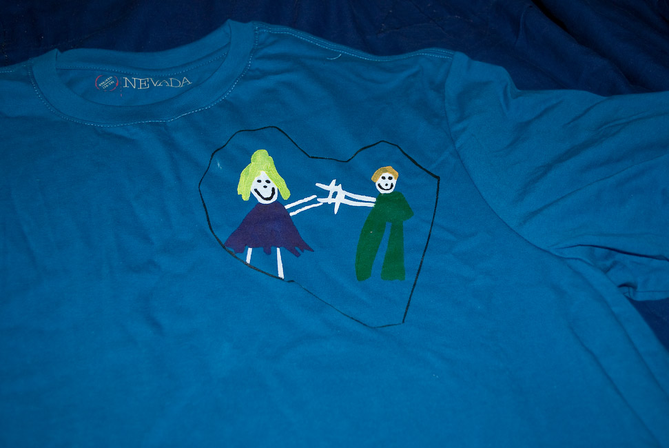Then iron the paper, including the little pieces such as around the arms. Since Lilo drew a heart around her and dad I cut a thin line around the shape so I could include on the shirt. Then I painted the shirt using the drawing as a guide for where to put the colour.