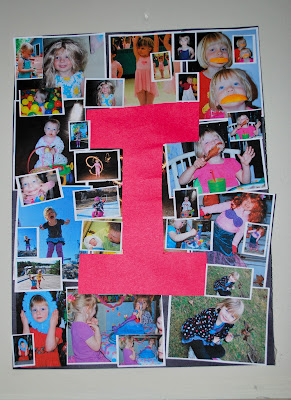 After cutting them all out she placed them on a sheet of paper so we could see how many we could fit. She also cut out the red I to put on after the pictures were glued down.